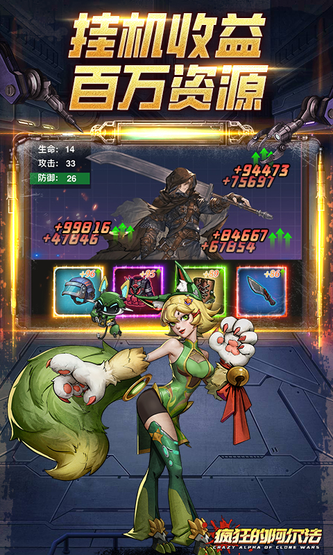 《疯狂的阿尔法》是一款以末日废土+科幻克隆为主题的放置卡牌游戏。游戏采用新奇暗黑风格,将荒芜的废土世界与失控的克隆科技完美融合,带来极具冲击力的视觉体验。在这里,玩家将扮演一名末世冒险家,收集并培养来自不同时代的传奇克隆战士,组建最强克隆军团!