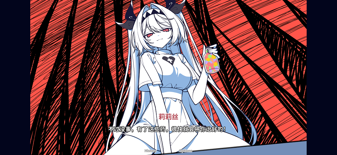 #画面# 人物立绘十分精美,白毛加红瞳,声音也很好听,有中,日配音(偏恐怖的视觉小说,但没有突脸,只是有些选项比较奇怪)