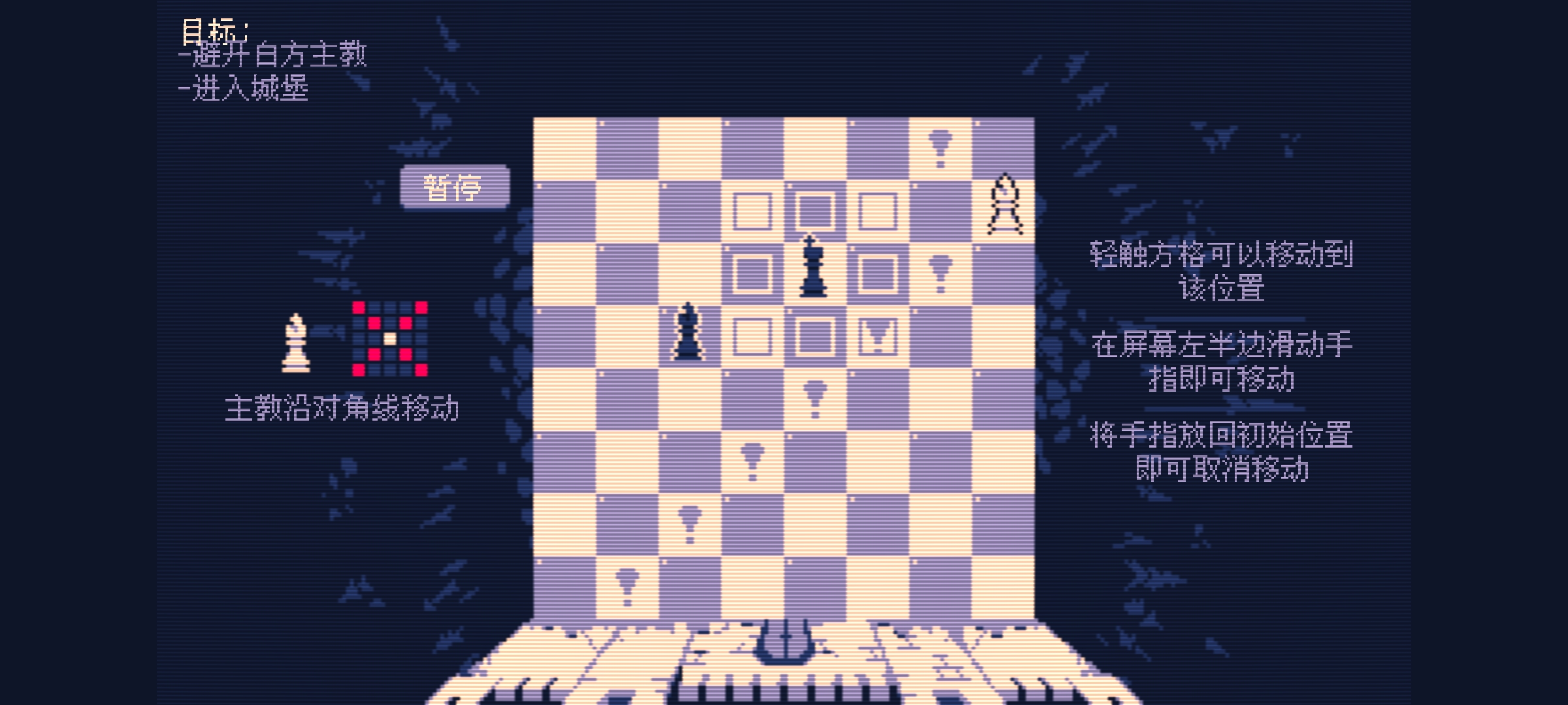 每回合,你可以选择移动你的国王或射击敌方棋子,之后你需要再次移动来重新装填霰弹枪。避免被将死,并击杀敌方国王即可通关。每通关后,你可以从两种随机组合中选择一项对你有利的升级和一项对敌方有利的升级。谨慎选择,不断赢得下一关,你或许就能夺回你的王国。