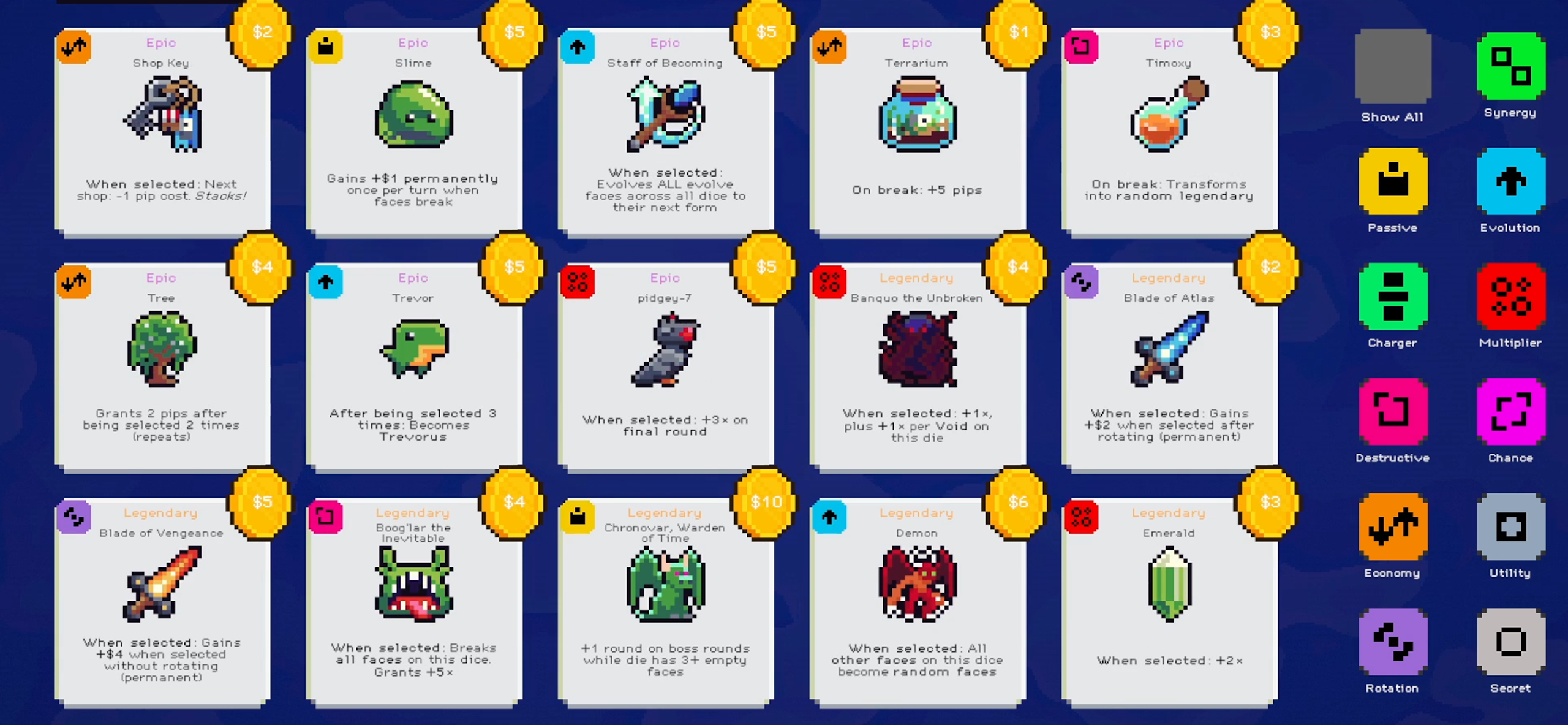 回合间隙,在商店花费点数,逐个升级你的骰子。解锁
