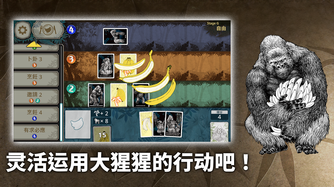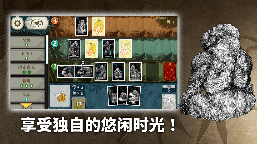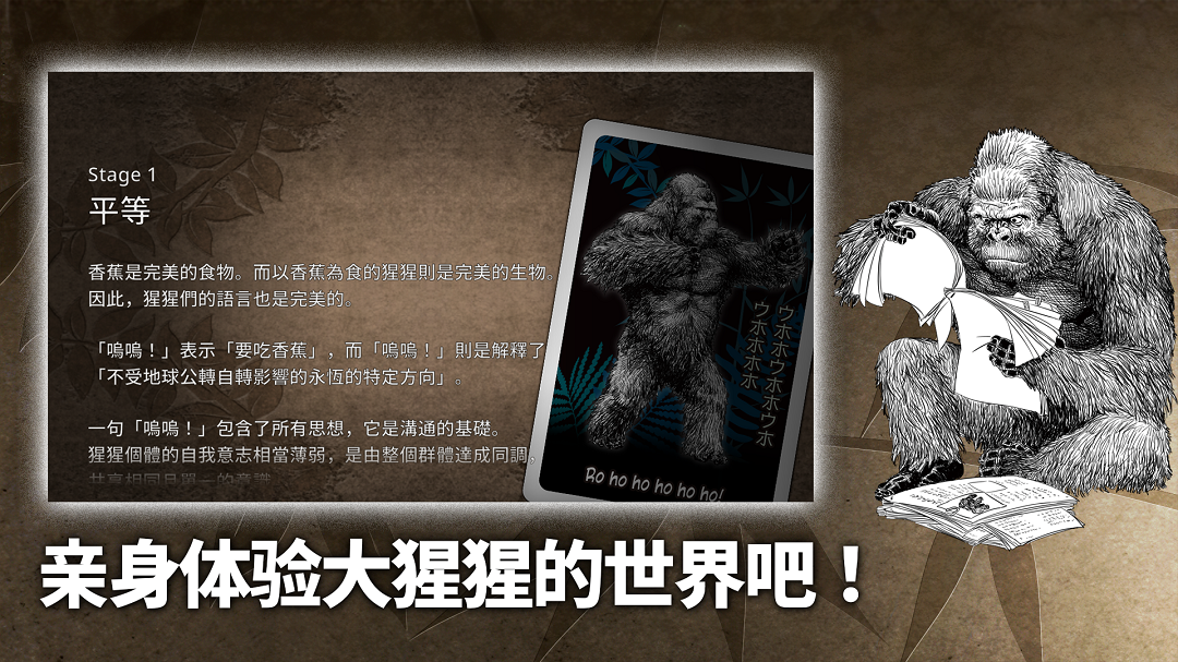 猩猩是从哪里来的? 猩猩是什么样的存在? 猩猩又会往哪里去? 单人游玩的猩猩游戏 这就是香蕉猩乐园! 让粮食香蕉维持足够的存粮,发展部落并扩展猩猩的生存权吧! 为了在游戏中赢得胜利,必须让7只以上的猩猩排在牌面上, 但只要有猩猩拿不到香蕉即失败,部落也会瓦解。