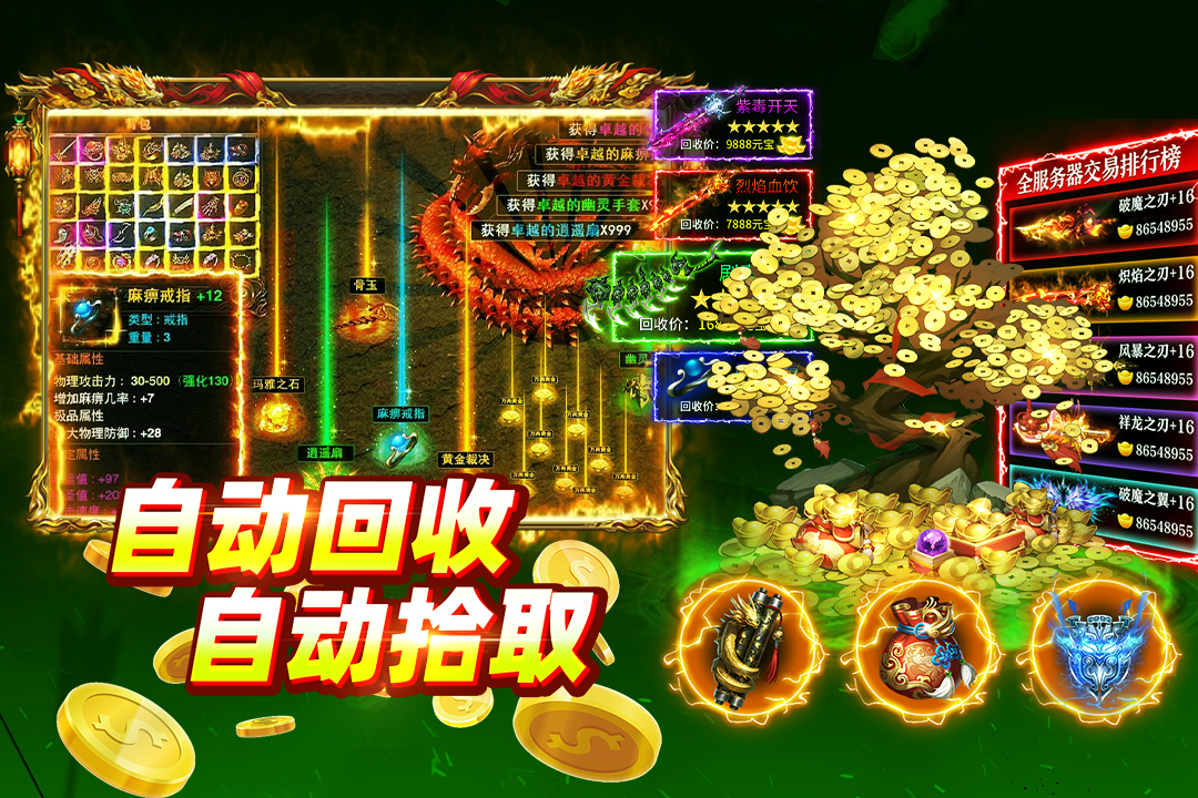 《大剑传奇》是一款原汁原味的复古传奇手游,完美还原经典“战法道”三职业。地下抢宝、激情乱斗、树妖降临、仙魔大战、热血攻沙等经典玩法一应俱全,更有远古战场、洪荒禁地、群雄逐鹿等重磅跨服战场,点燃无限激情! 游戏主打高爆率、装备靠打、自动回收、元宝持续产出,轻松挂机即可打宝赚收益,散人也能畅快逆袭!新服盛大开启,福利拉满 —— 自动回收、自动拾取、背包全开、会员免费开通,上线即享超爽体验!