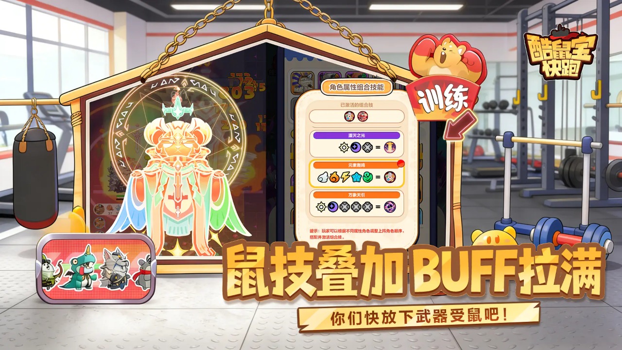 1+1+1=团队组合技能大爆炸!你不信?等鼠鼠我蓄满怒气,你们就等着受鼠吧!上阵鼠宝属性叠加,同属性不断叠加,BUFF拉满。