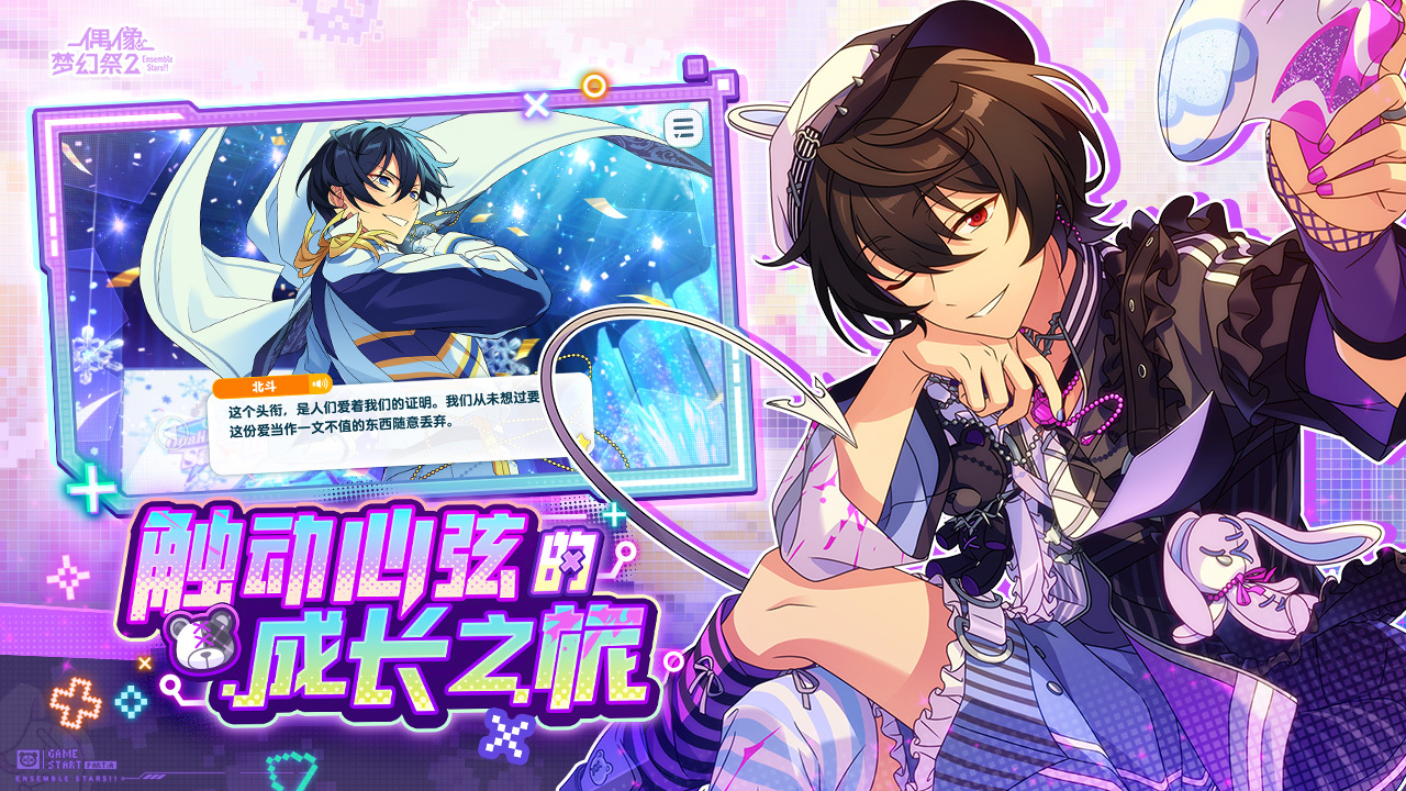 《偶像梦幻祭2》的剧情承接《偶像梦幻祭》的剧情,由知名轻小说家“日日日”主笔,偶像们正式从校园走向社会,但成长和蜕变的过程中不是一帆风顺,总是充满了各种疑惑、踌躇、欢笑和泪水,他们在合唱广场里每天都上演着不同的羁绊故事,让玩家充分融入沉浸其中,每分每秒都牵动心弦!