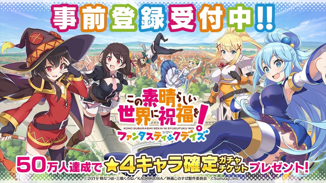 《为美好的世界献上祝福! Fantastic Days》是由 Sumzap 以人气轻小说《为美好的世界献上祝福! 》改编的 RPG 手机游戏。本作讲述不幸遭遇事故而丧生的高中生佐藤和真,凭借女神阿克娅的力量转生至异世界,并在那个世界与女神阿克娅以及一众伙伴共同冒险的故事。在游戏中,佐藤和真、阿克娅、惠惠以及达克妮丝等熟悉的角色均将登场。配音则将采用动画中使用的相同声优阵容,而游戏中的原创剧情部分,也将采用全语音形式呈现给各位玩家。
