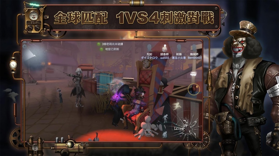 玩家在游戏中可扮演求生者和监管者两种角色,四个求生者的目标是破译5个密码机从大门逃脱,监管者的目标则是淘汰所有的求生者。游戏中,玩家利用角色的专属技能或者道具,在一场场追逃游戏中感受心跳的刺激与策略博弈的畅快。