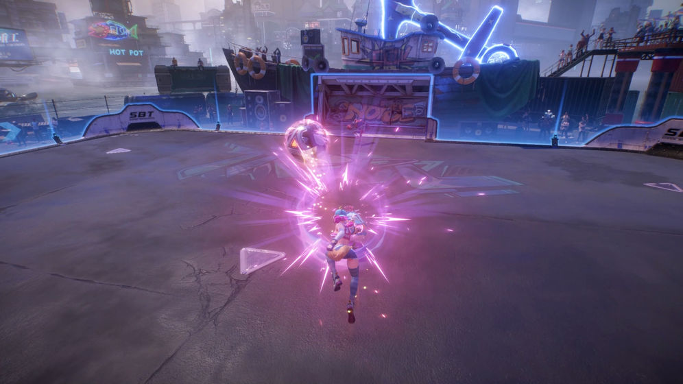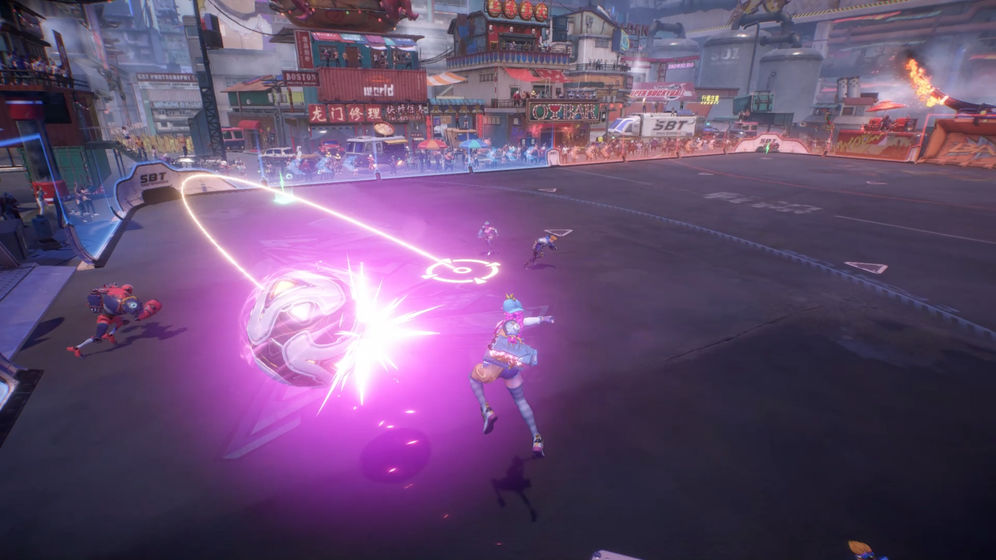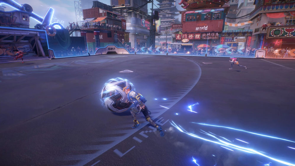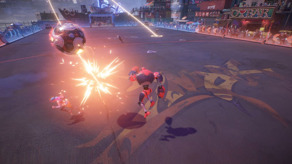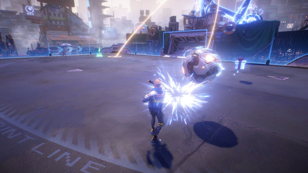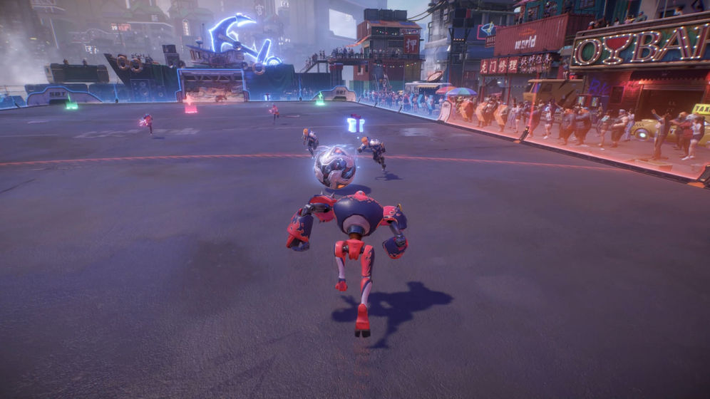 游戏背景设定在近未来的赛博朋克世界内,在这里您将挑选一个喜欢的英雄,三人一队进行对抗比赛,传球抢球,射门得分。