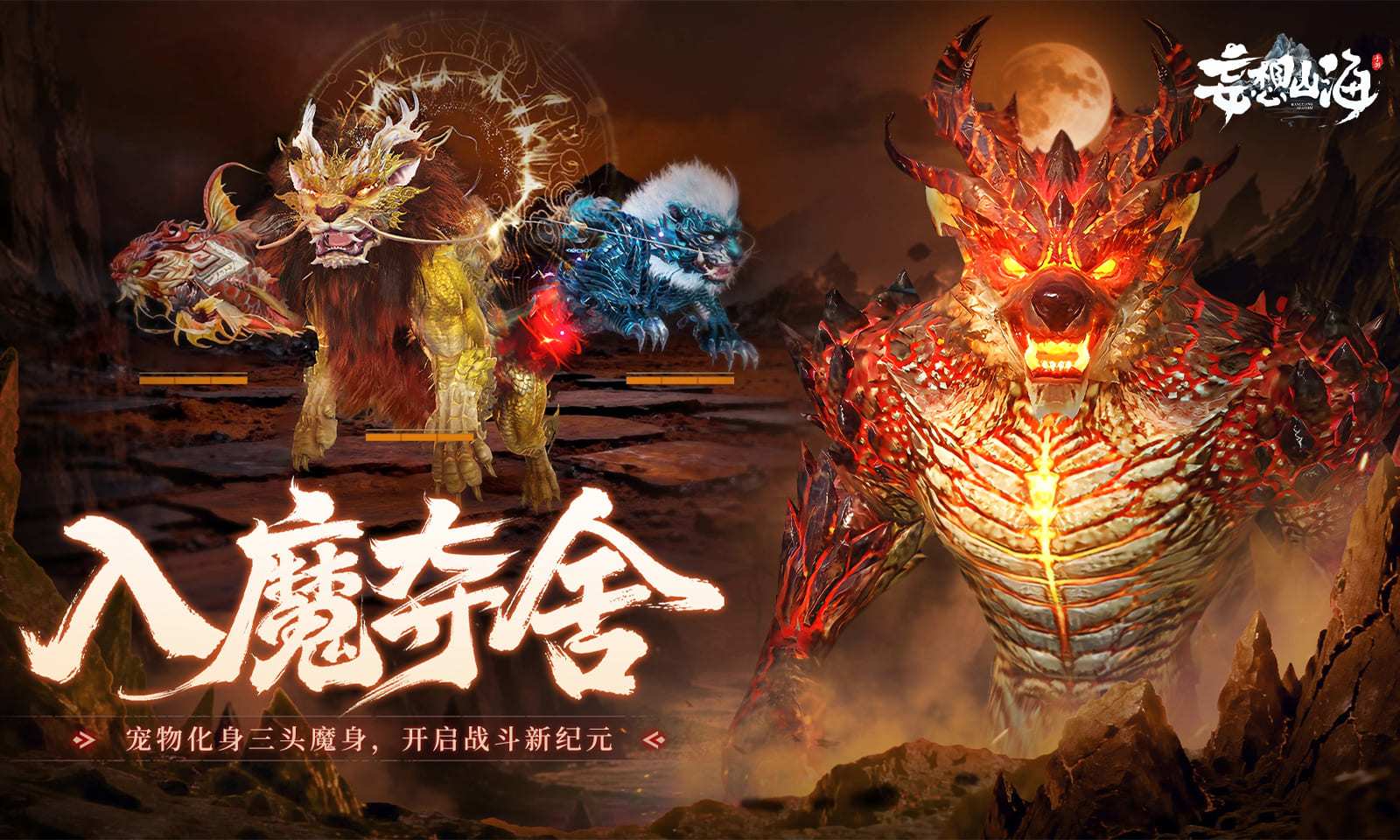 3. 宠物达到五万年时,则能自动解锁【入魔】技能,解锁魔躯插槽,接入【魔躯】宠物,即可开启魔躯技能。魔化宠物的【魔躯】技能效果会根据接入的魔躯,获得专属效果。当前版本可变为魔躯的宠物:白娘子、比翼鸟、冲炎·破序之触、耳鼠、虹虹、火狐、金乌、精卫、龙马、陆吾、莽苍·三骓马、莽苍·巽羽六雏、饕餮、玉兔,魔躯可在宠物魔化期间提供增益或协同作战