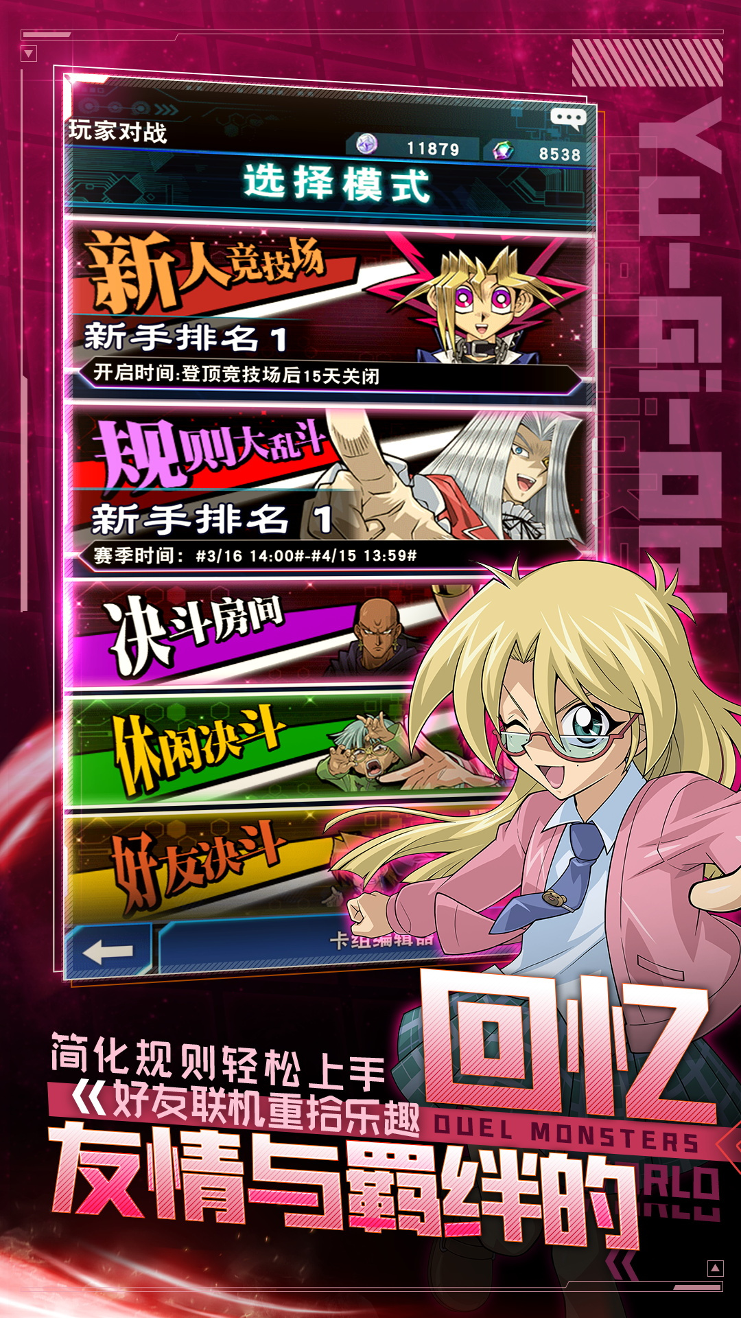 《游戏王:决斗链接》提供了丰富的实时PVP玩法,您可以在排名决斗中挑战来自全国各地的决斗者,成为最强决斗王!您也可以通过好友决斗,与朋友来一场轻松有趣的娱乐局,重温童年记忆。这里还有休闲决斗、决斗房间等不同的PVP模式,满足您多样的决斗需求。