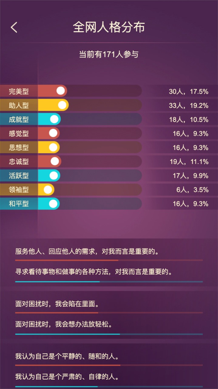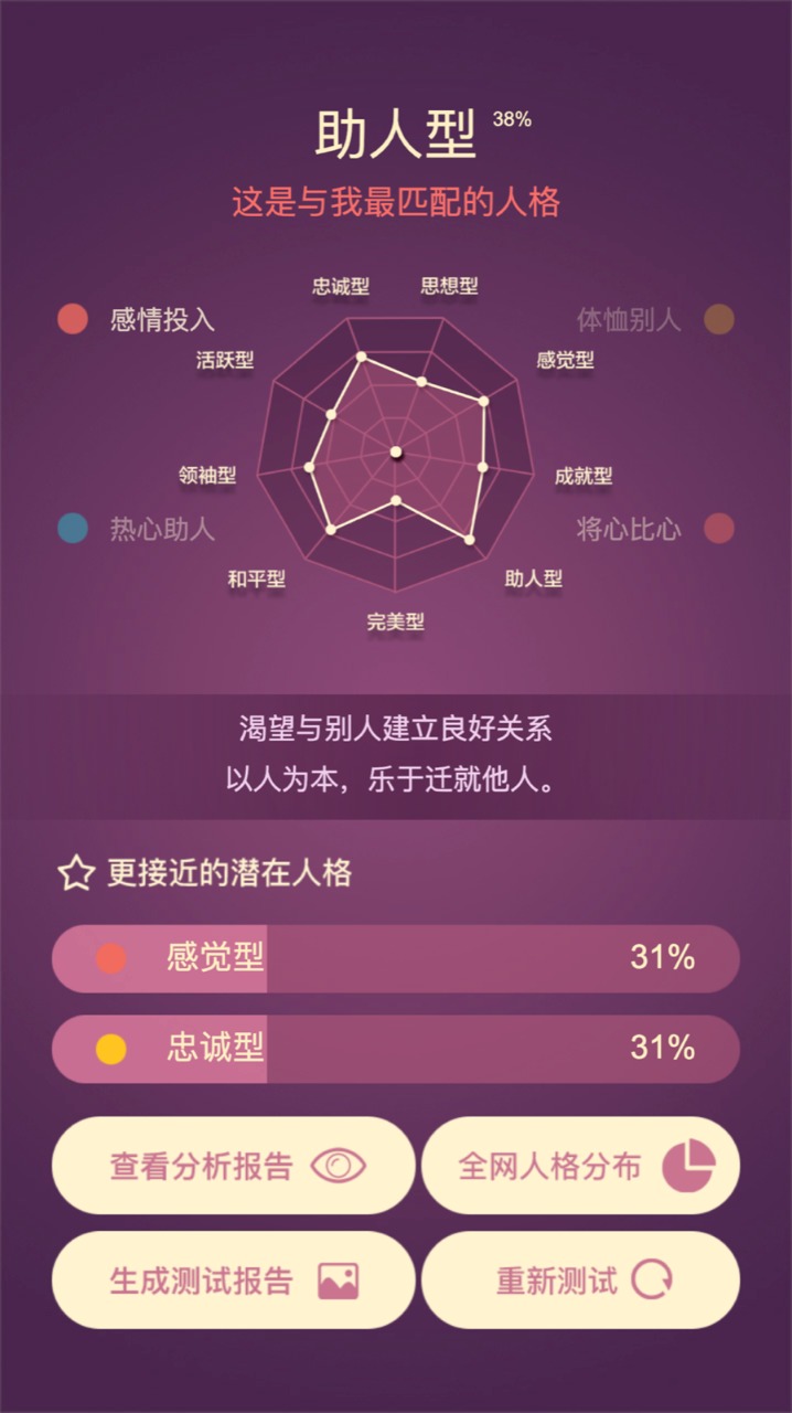 九型人格是古老的学问,它按照人们习惯的思维模式,情绪反应和 行为习惯等性格特质,将人性格分为九种。 1号性格:完美主义者; 2号性格:给予者 ; 3号性格:实干者 ; 4号性格:悲情浪漫者 ; 5号性格:观察者 ; 6号性格:怀疑论者 ; 7号性格:享乐主义者 ; 8号性格:保护者 ; 9号性格:调停者 根据自己的实际情况选择你认为对的选项。选择的目的在于了解自己,请尽可能选择你的自然偏好。 跟随神秘的音乐,来一次沉浸式的测试体验吧!