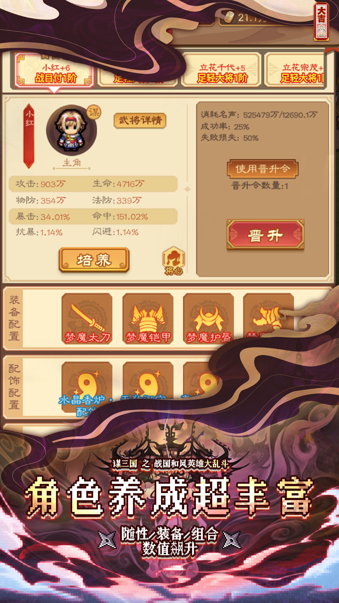 《谋天下》9月22日计费删档测试震撼开启。10分钟轻松上手,超爽和风像素挂机大乱斗!战国乱世来临,你将成为乱世中一名战士,为了追求内心信念而不断进行冒险,最终成长为顷世大名。经典放置挂机玩法,主城挂机收益无囤积上限,充分满足玩家碎片化时间的贴心设计!复古像素风封战国大名,精美和风