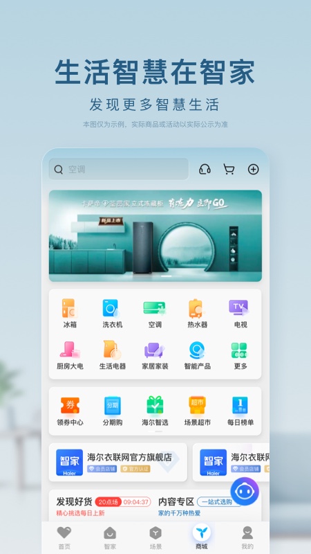 海尔智家新版“商城”板块,涵盖家电、场景、优质内容,为您推荐适合的家电和家装风格,带您发现更多生活智慧。以精简页面,保留你想要的,展示你想看的;