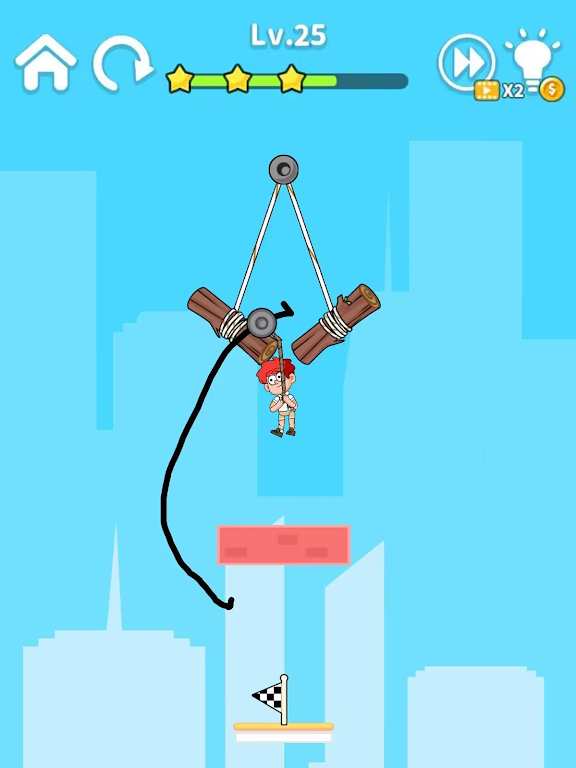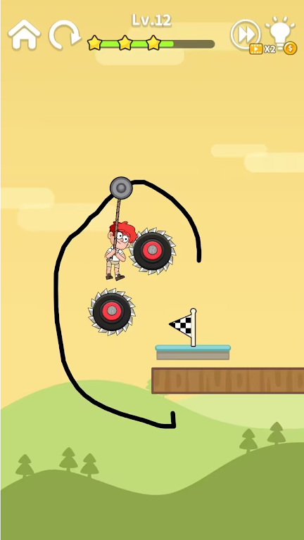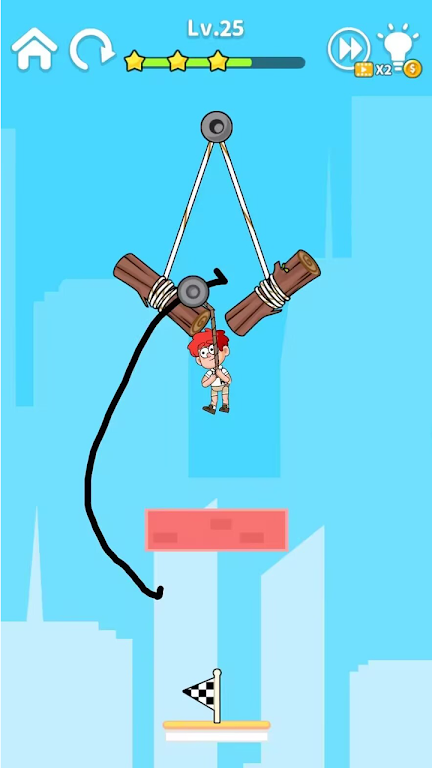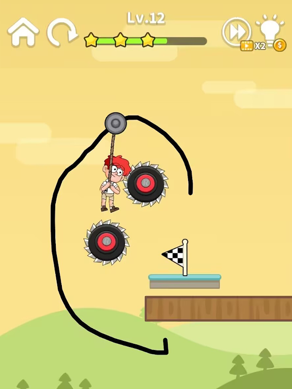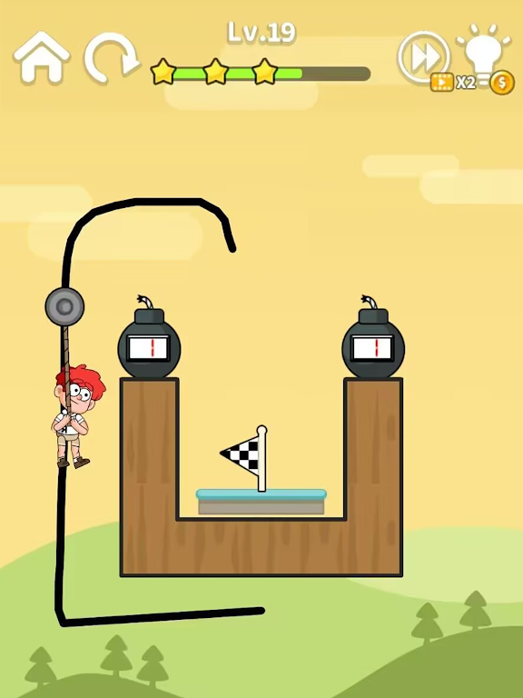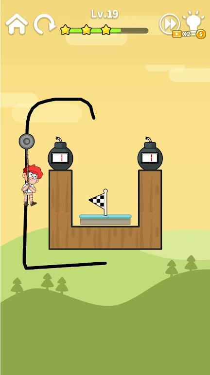 为了成功营救小囧,您需要用手指画一条线作为滑索的路线。 当您的手指离开屏幕时,滑轮会带着小囧沿着这条路线移动,直到他成功到达安全点。 小囧唯一可以依靠的就是他手中的绳索和您绘制的战略路径!