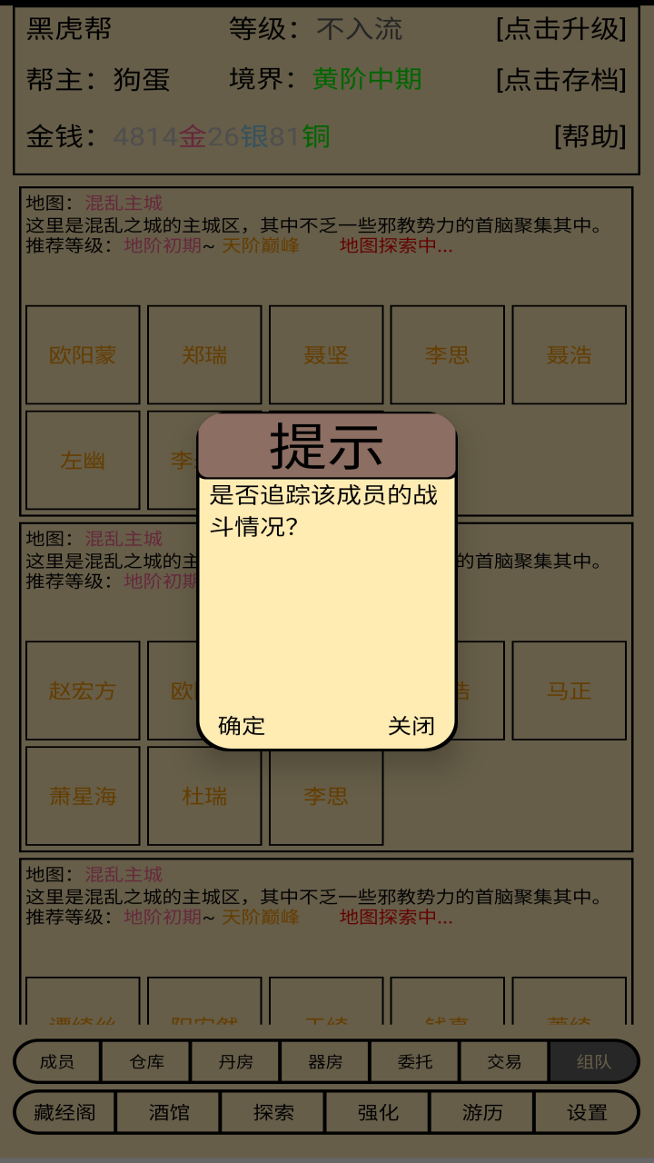 一个模拟帮派经营的游戏,游戏内可以招募帮派成员为你打工,里面做了一些简单的帮派成员AI行为。比如成员直接可以相互组队挑战地图,自动挑选适合自身的功法装备,并且可以将自身掉落物品材料相互交易,收购需要的材料自行炼丹炼器等等,帮派可以在成员交易中获得相应的交易税收。玩家也可以多多提升帮派建筑,为成员提供便利的同时也可以获得可观的收益。还有一些方面也不好一一列举了
