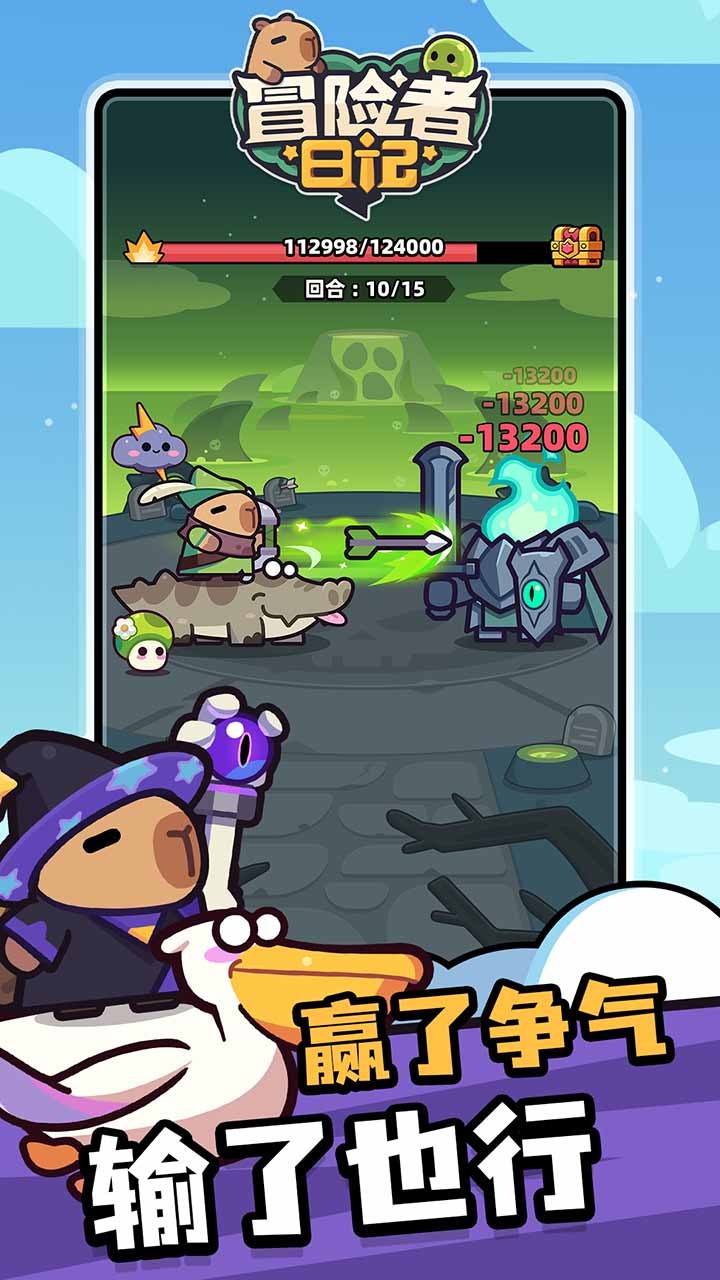 这游戏是2D卡通画风,配色明亮,卡皮巴拉形象IP讨喜,第一眼印象不错。 它是偏单机的肉鸽RPG游戏,玩法规则虽在同类游戏中已有,不停点击下一天会随机出现增益或减益效果以及战斗事件,战斗是类似一代卡牌的简单回合制。 至于其他优点,肉鸽三选一有随机性和选择策略,但运气成分较大。有完整新手引导,点击操作简单易上手。