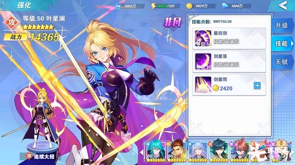 技能3:剑星雨 挥动手中的星神剑,剑芒如雨般打击单体敌人,造成大量伤害,并随机对两名敌人造成同等伤害,额外造成大量点固定伤害