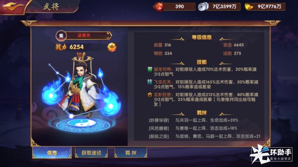 【简评】诸葛亮是蜀国名将的典型代表人物,高额的AOE伤害技能,能大概率造成敌方的减员,还有高概率的多控制手段,不论减少敌方怒气还是眩晕,都让敌军防不胜防,起到极大的干扰作用,势均力敌的对战中效果尤为明显。