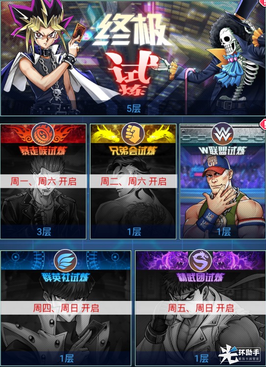 终极试炼是《乱斗之王》中的爬塔副本,分为综合型的终极试炼,与阵营型的暴走族试炼、兄弟会试炼、W联盟试炼、群英社试炼及精武团试炼。在终极试炼中,每层通关后都会有经验药剂和钞票奖励,首次通关会有活力药剂,每通10关可以领取额外奖励,每30关可以领取头目碎片。