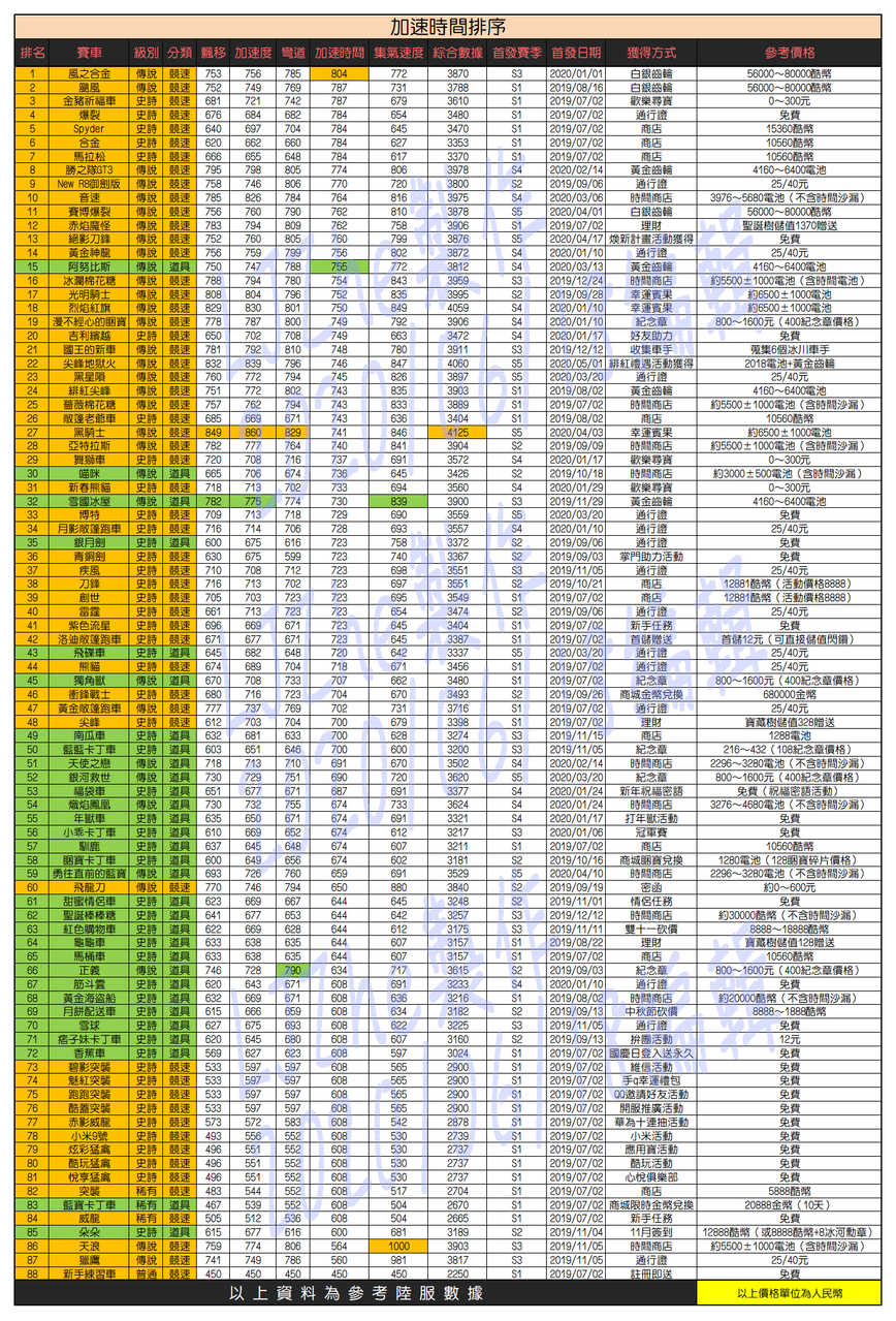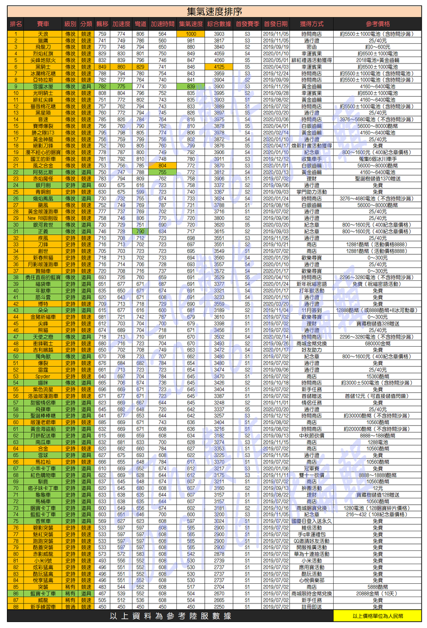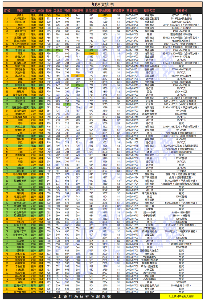 《跑跑卡丁车Rush+》车辆属性对比图