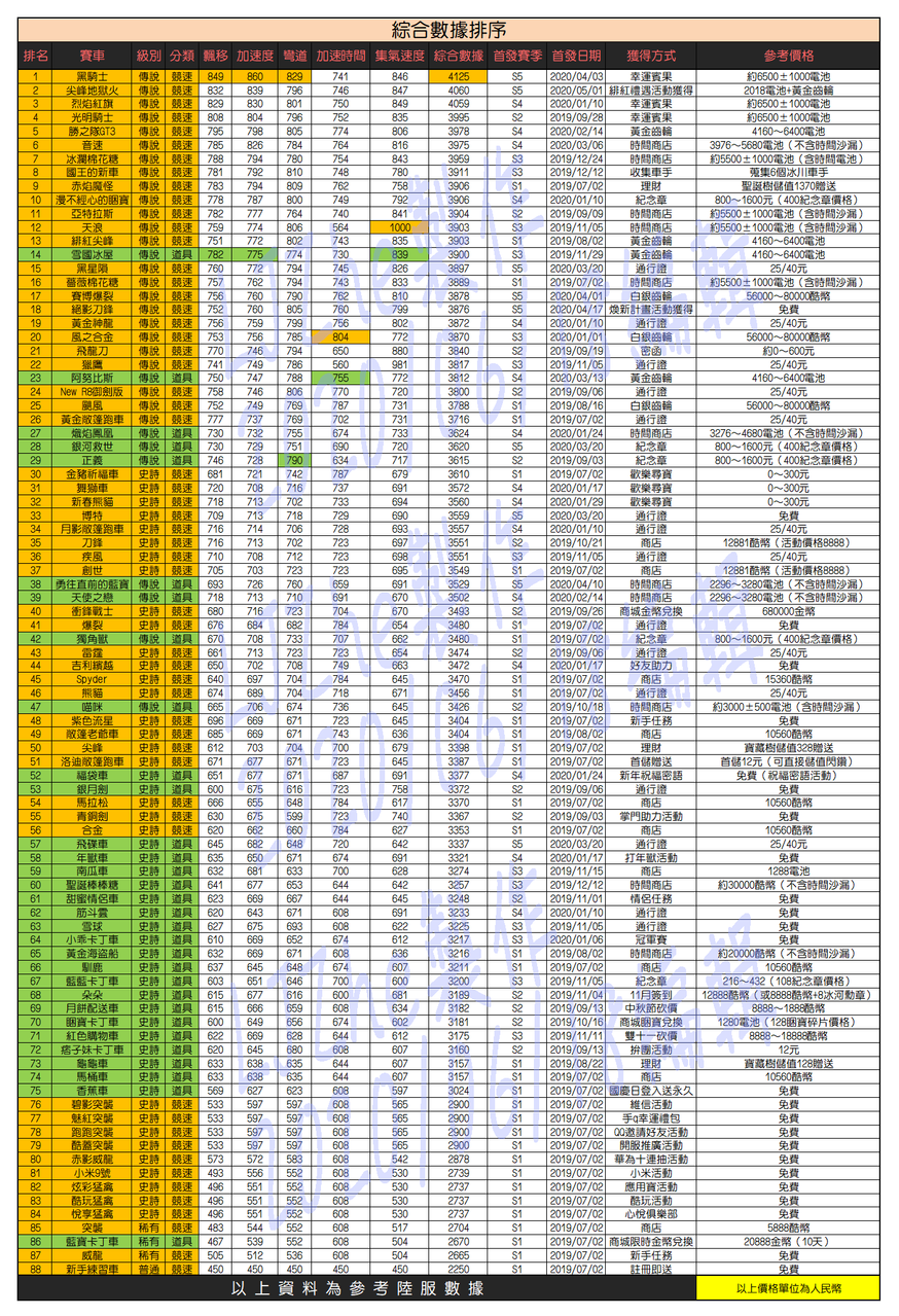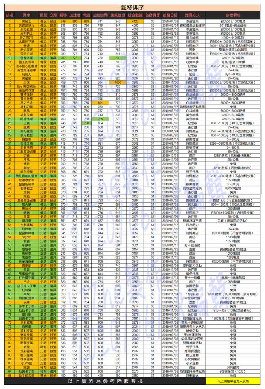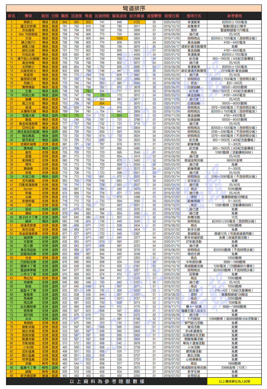 《跑跑卡丁车Rush+》车辆属性对比图