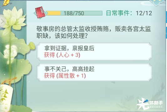 建议小主前期日常系统奖励都选择人心,方便前期任务的完成。身份等级越高,日常事件获得人心越多。同时可消耗日常令增加日常次数。(ps:日常令可通过每日任务和各种游戏运营活动获得)