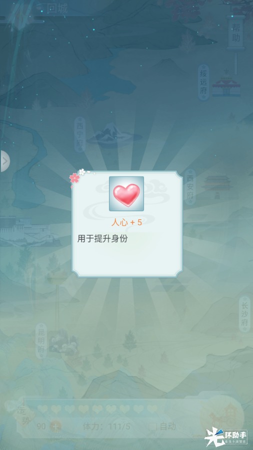 小主通过出城系统有几率获得人心。同时可消耗出城体力丹回复次数。(ps:建议出城时将运势保持在90,可设置自动补偿运势。)