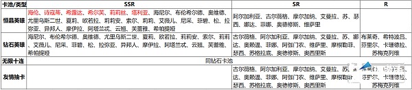 2.英雄召唤,需要花费的道具为钻石、抽卡券、友情点(最重要的是开局给的无限十连券);英雄召唤卡池中有SSR、SR及R英雄,又可细分为召唤卡池、无限十连卡池以及友情卡池。英雄召唤中获得的角色必定没有上表中红色字体标注的英雄。即海伦、诗寇蒂、希露达、希尔芙、莉莉丝、塔利亚有且仅有在恒晶抽卡中获得,因而一般特指他们为恒晶英雄。