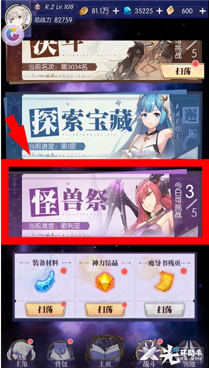 呐,我们看到这位勇者很勇敢的点击了“战斗”页面内的“怪兽祭”。“怪兽祭”当然是今天的直播节目啦。跟随勇者们的镜头,我们可以看到怪兽祭有丰厚的奖品,包括装备材料,神力结晶,残页等等,大家是不是很想要?
