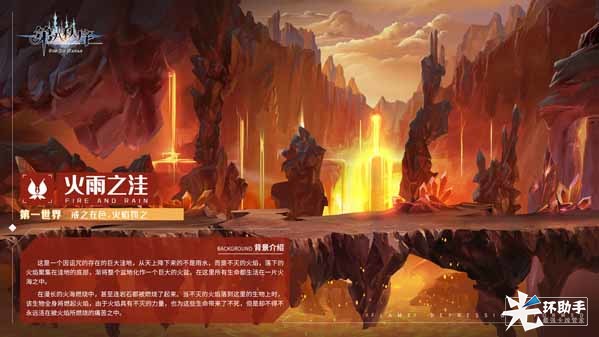 不同于其他洼地,『火雨之洼』是一个因诅咒而存在的巨大洼池;在这里,从天而降的不再是寻常的雨水,而是不灭的火焰,落下的焰火聚集在洼地底部,逐渐将整个盆地化作一个巨大的火盆,宛如一片火海,所有生灵都被桎梏其中,火中做自己。