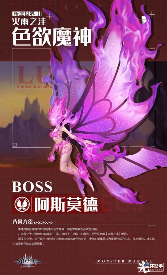 色欲魔神阿斯莫德,一只半裸着、有着性感胴体的蝴蝶魅魔,舞着燃烧着的紫红色翅膀,风中摇曳着醉人身姿,摄人心魂。