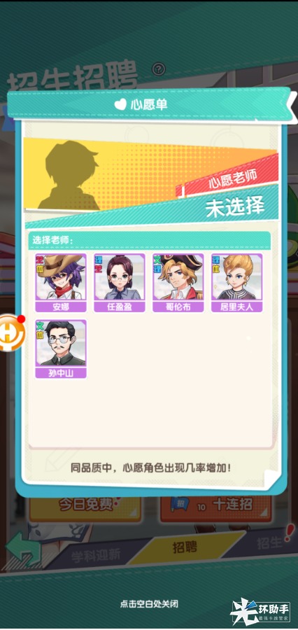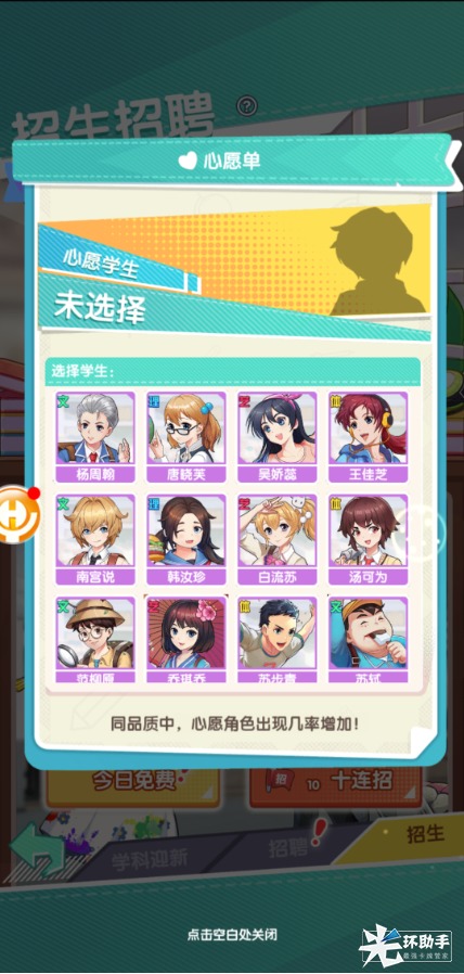有一点要注意下,招生和招聘的卡池中都有一个叫心愿单的东西,你可以看看哪些学生的2阶立绘你比较向往,或者哪些老师你比较喜欢,都可以在这里填写心愿单。