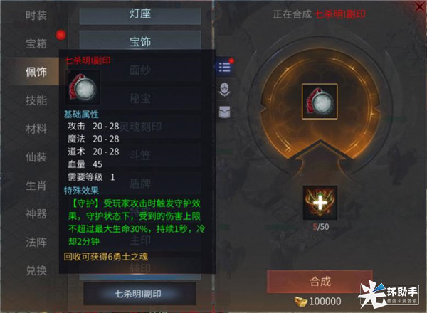 辅印与主印相同都是提升玩家攻击及血量,且附带效果【守护】受到玩家攻击时触发守护效果,守护状态下,限定伤害最大值给予玩家自身血量百分比。有技能持续时间及冷却时间。