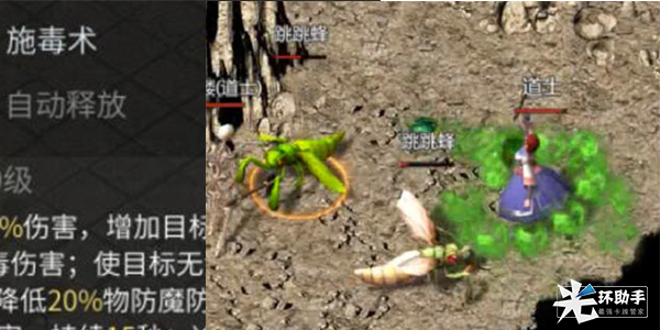 施毒术:道士核心的伤害技能。对目标挥出剧毒,造成伤害的同时使敌人进入长时间的中毒状态,降低防御和魔防,不断地受到体内毒药的损伤。这个技能不仅能造成可观的伤害,还能提高己方的输出效果。并且,剧毒还能令怪物血气阻塞,无法恢复生命,大大提高了刷怪的效率。