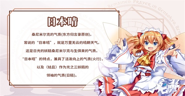 “日本晴”的特点,兼具了活泼向上的气质(火行),以及(姑且)作为光之三妖精的领袖的气质(日精)。