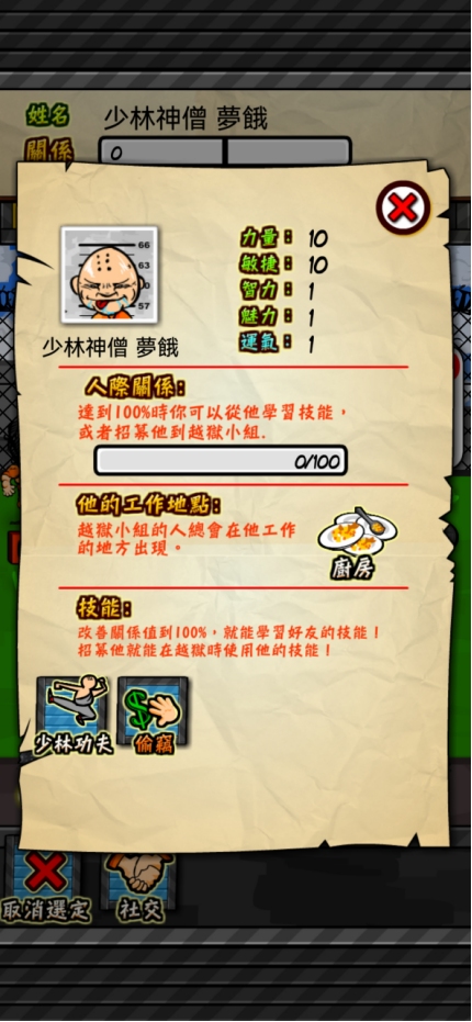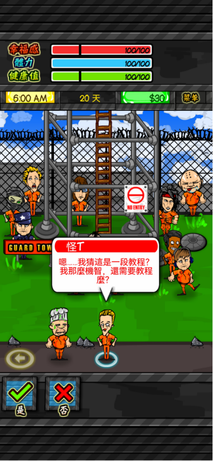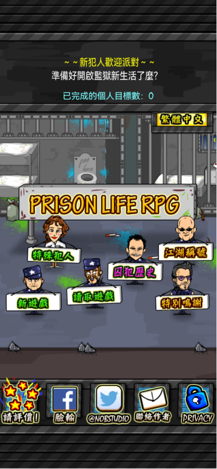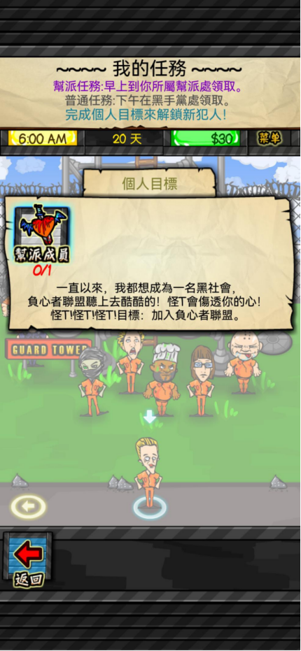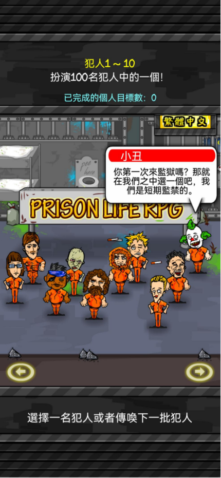 游戏开始主界面,玩家可以进行语言选择,选择到繁体中文就可以开始探险之旅啦。游戏题材背景是监狱,所以玩家在游戏中的角色也就是犯人啦,不过现实中监狱可不是什么人都可以待下去的(游戏中也一样啦),而玩家需要做的就是在监狱中要生活下去之外,还要找寻同盟,然后结成帮派,最终目的相信小伙伴们都很清楚,那就是进行越狱,当然了,这是一个比较遥不可及的想法。这里需要多说几句啦,游戏中的犯人大部分都是短期服刑,可能还没到计划开展时,你结盟的小伙伴都放出去了,甚至角色本身都有可能放出去了,计划还有什么实施的意义呀?游戏设计的还是有些小问题。