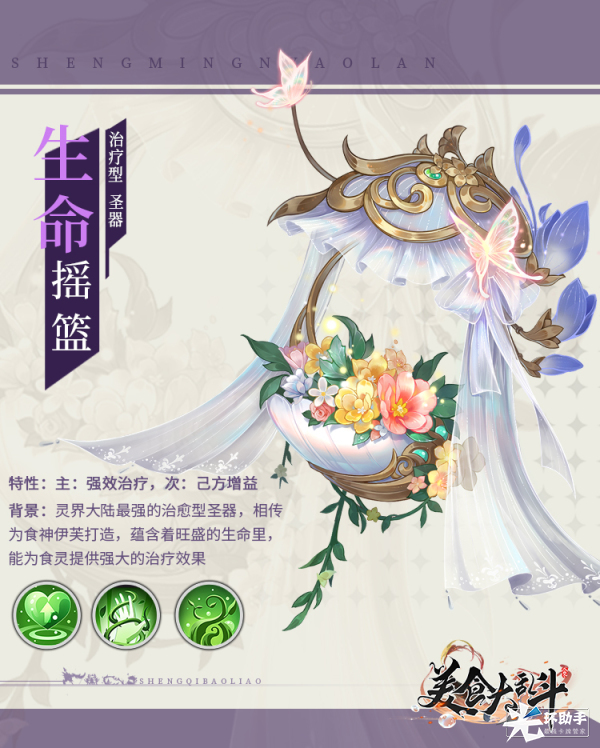 【背景】:灵界大陆最强的治愈型圣器,相传为食神伊芙打造,蕴含着旺盛的生命里,能为食灵提供强大的治疗效果。