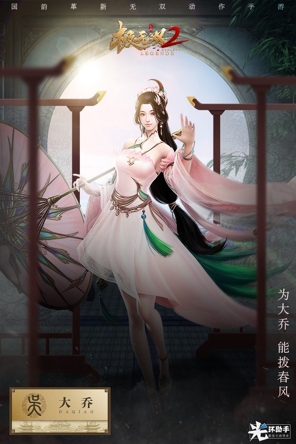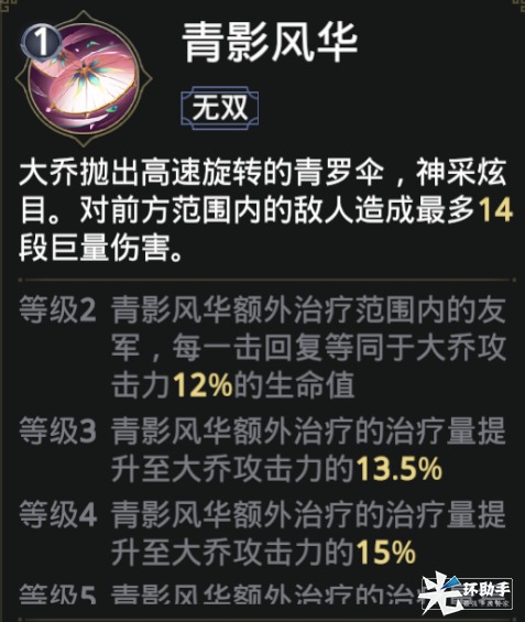 无双技能【青影风华】,能够造成巨量的范围伤害,可以说是绝招。当技能等级提升后,这个技能还能给自己和友军回复生命。这就使得大乔在60v60的势力战、3v3公平竞技又或者是野外混战抢BOSS时,优势极为明显,无论是作为输出主力,还是利用无双技能给予队友治疗,那作用都是杠杠的!