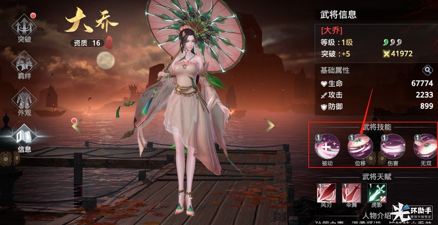 2、品质为红,品质相对较高。大乔可能是你能在游戏里最先能体验到的红色武将,同时由于获取的较早,在培养起来也会比其他武将抢先一步。