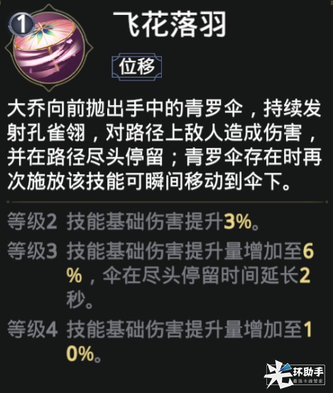 【飞花落羽】这个技能是大乔向前抛出伞,持续发射孔雀翎,对路径上敌人造成伤害。