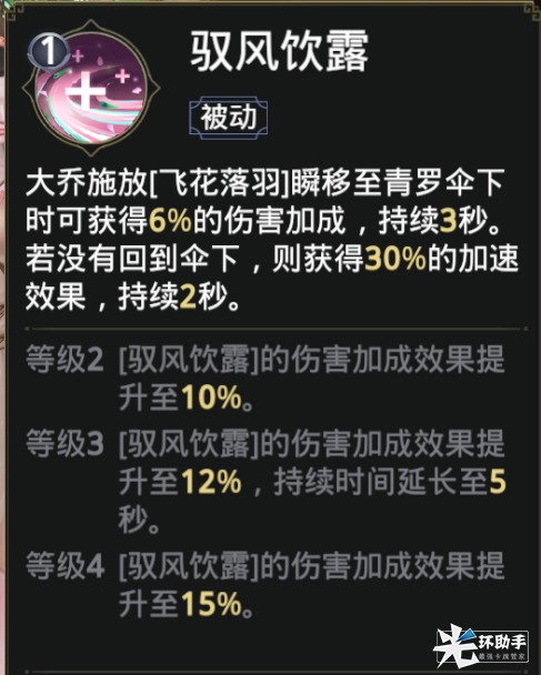 此外,更具策略性的一点是,大乔的被动技能【驭风饮露】也是通过【飞花落羽】触发的。