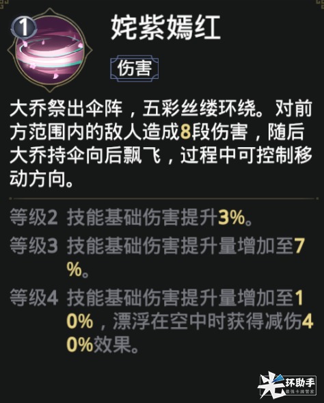 伤害技能【姹紫嫣红】,可以对前方范围内敌人造成8段伤害,并且随着技能等级的提升,还能提升基础伤害及减伤效果。