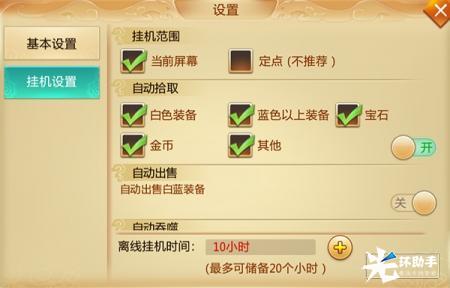 4、挂机设置,玩家可在‘设置’—“挂机设置”中进行设置,如:自动拾取、出售、吞噬装备,离线组队或自动买活
