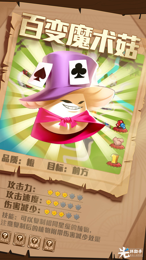 合并两个百变魔术菇,在我方场上一定数量的植物提升大量伤害,持续一定时间。