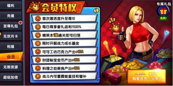 会员特权:大量必拿游戏特权和每日专属礼包(体力、金币、格斗家升级材料),你值得拥有,战斗内可重置能量技和替补此特权更是可在战斗中逆天改命,斗转乾坤!