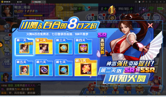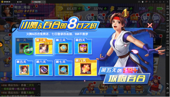 3.登录第一天就送顶流MM-不知火舞,登录第五天还送SR+坂琦百合,更有觉醒装备、百连抽免费拿,轻松助力闯关,战力狂飙