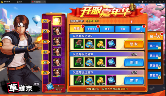 4.开服嘉年华,免费获取海量钻石以及草薙京碎片,进行完美升级。还有诸多奖励可以领取