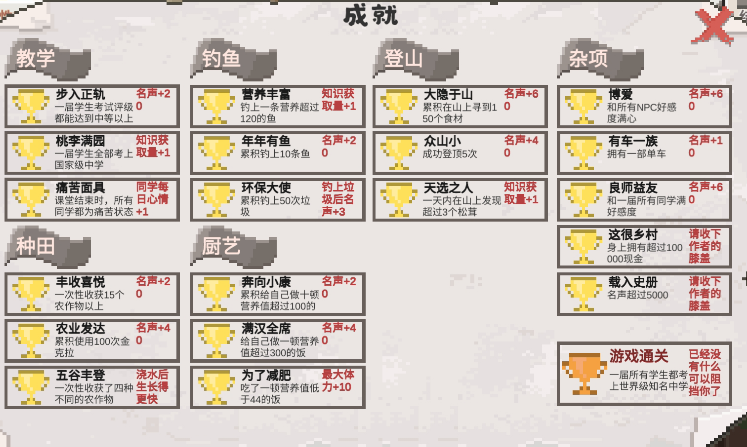 在游戏中,金钱,体力,名声是三个重要的属性,学生成绩和成就则这两个重要指标。游戏中,一些隐藏成就要求如下图所示
