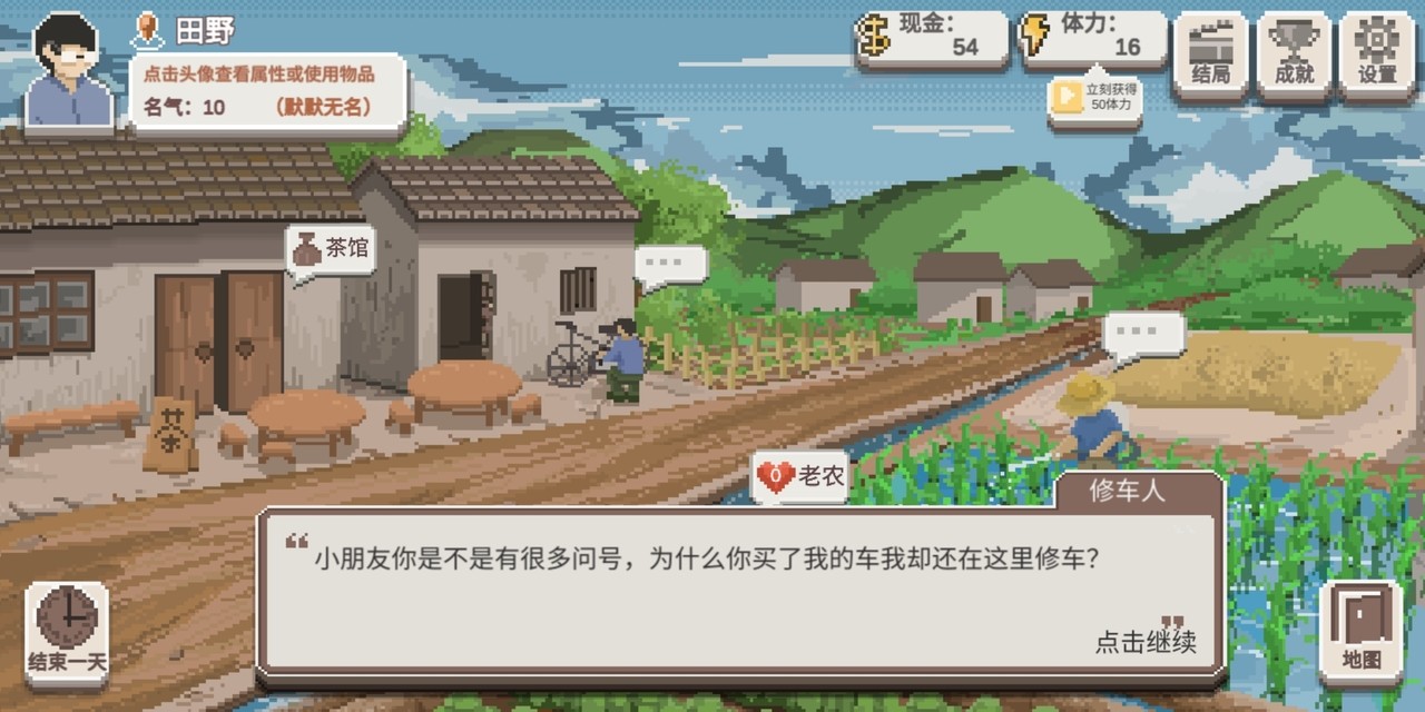 绝大多数情况下,开局都要去田野买单车。不然来回跑图需要花很多体力。单车还能卡一些体力,经过一些地方,再到其他地方比直接到目的地更省体力,老旧单车在很多地方都能卡体力,我不直接介绍。凤凰牌单车经过印刷厂从田野到山涧比直接到省一点体力。