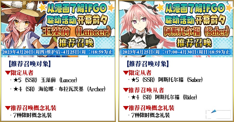 预定于2023年4月下旬开幕的「从漫画了解!Fate/Grand Order×Fate/Grand Order联动活动」的相关从者中,推荐召唤包含限定从者的8骑从者的4种卡池将在活动时间内替换开放!