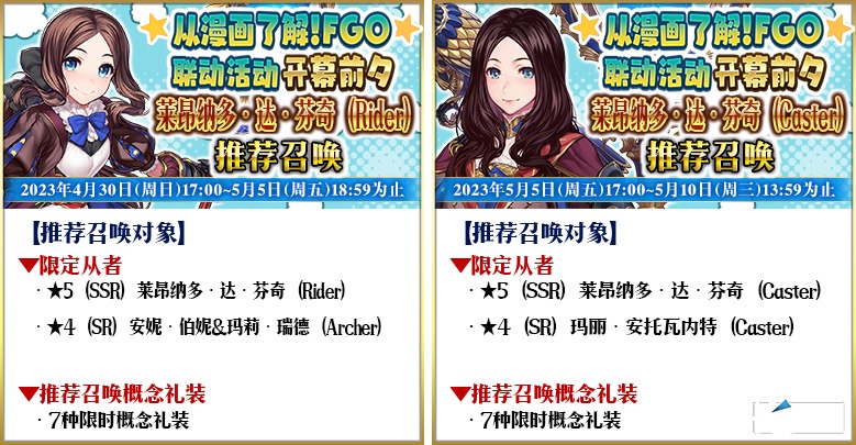 此外,在「从漫画了解!FGO联动活动开幕前夕推荐召唤」中,『从漫画了解!Fate/Grand Order』相关的7种限时概念礼装将在4种卡池中均被推荐召唤。